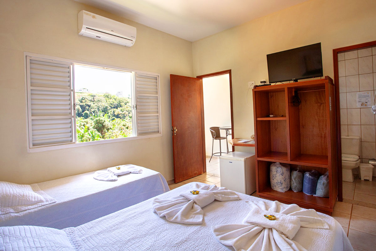 O Hotel possui 24 amplos e arejados apartamentos com uma área de 25 metros quadrados, varandas com vistas da cidade e da exuberante mata que margeia todo o hotel.